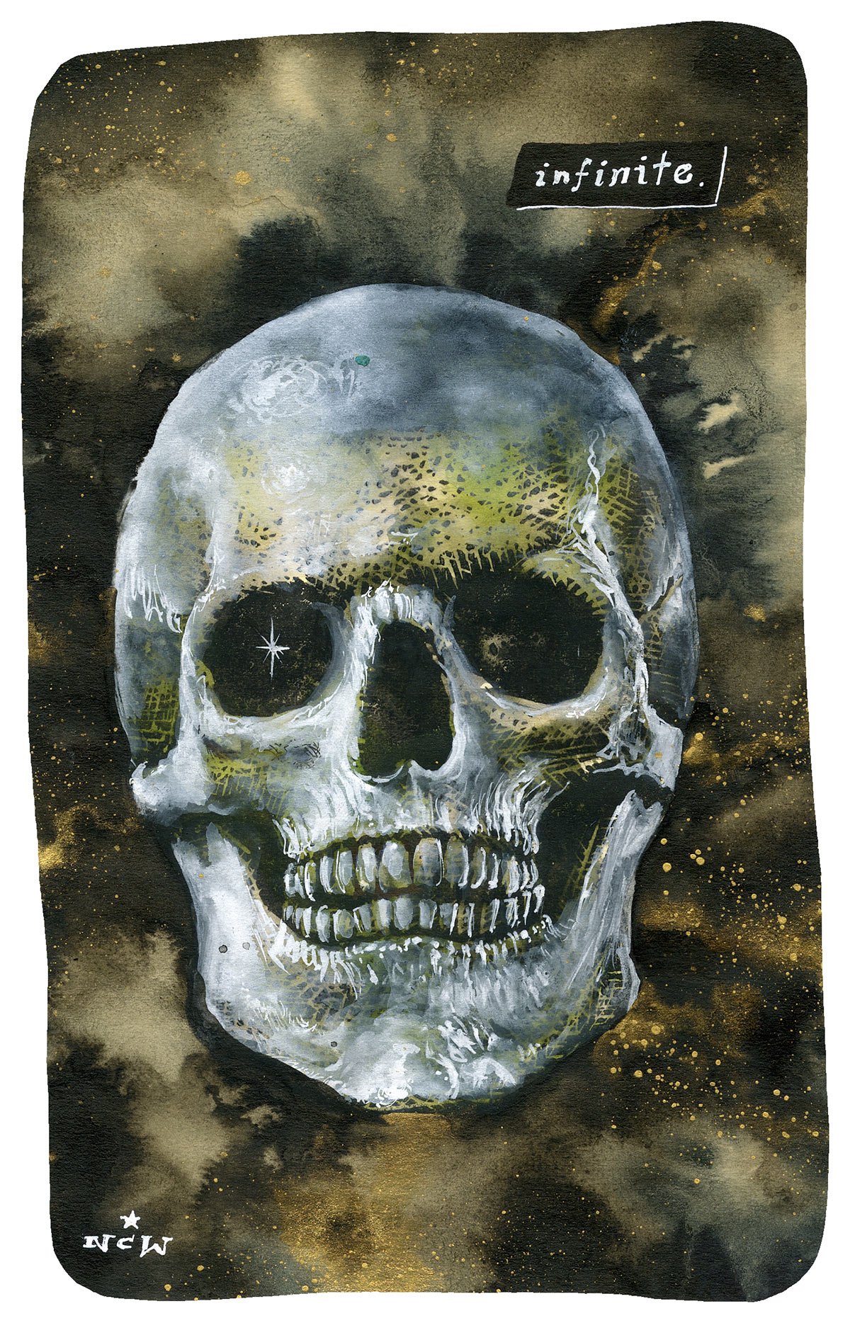 Pen & ink, ink wash, metallics and acrylic over linocut print on paper.